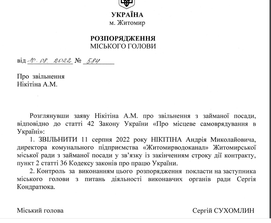 “Звільнити з 11 серпня 2022 Нікітіна Андрія директора комунального підприємства “Житомирводоканал” з посади у зв’язку з закінченням терміну дії контракту”, – йдеться у розпорядженні Сергія Сухомлина.