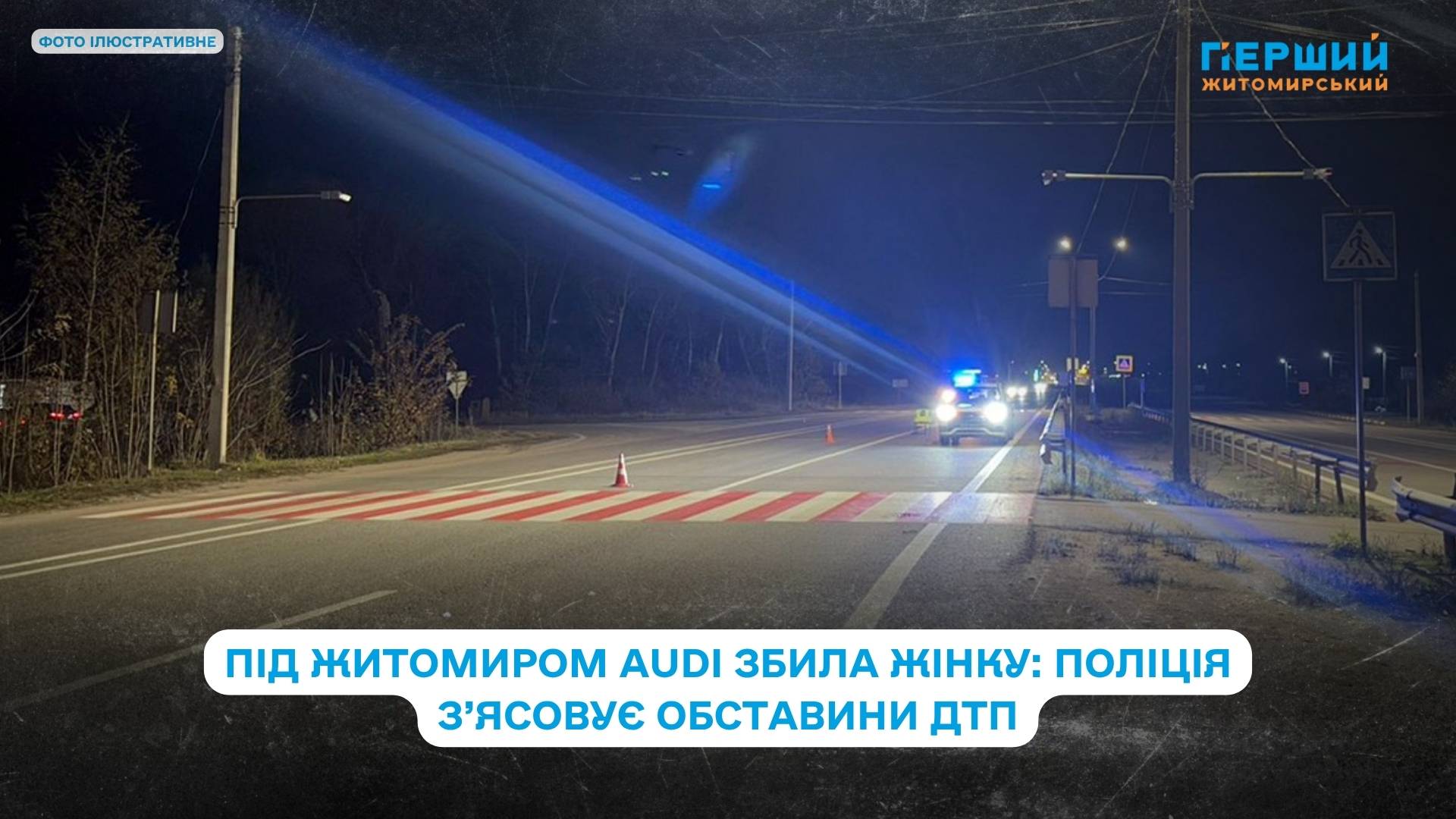 Попередньо встановлено, що близько 18:50 автомобіль Audi, яким керував 21-річний житель Київської області, рухався у напрямку Житомира. У цей момент на проїзну частину вийшла 38-річна жінка, мешканка Глибочицької громади, і сталася наїзд на пішохода.