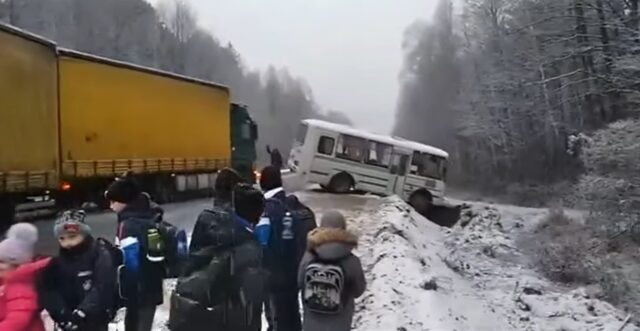 Діти зняли відео з коментарями “Отак ми й добираємося до хати”. Відео виклали в у Фейсбук. На ньому видно, як вантажівка витягує автобус із кювету.