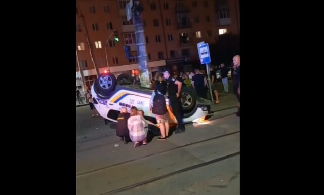 У Житомирі близько 00:00 год. 21 серпня на перехресті вул. Київська – Небесної Сотні навпроти ЦУМу сталося ДТП. У результаті зіткнення перевернувся автомобіль поліції охорони.