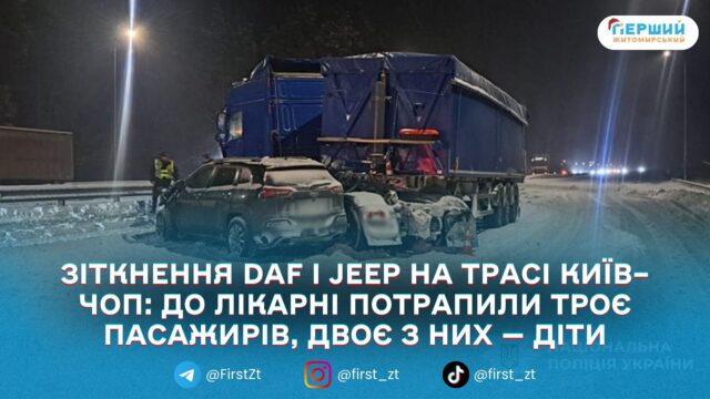 У Коростишівській громаді на автошляху Київ–Чоп сталася ДТП, унаслідок якої травмувалися троє пасажирів позашляховика, серед них — двоє дітей. Про це повідомило ГУНП у Житомирській області.