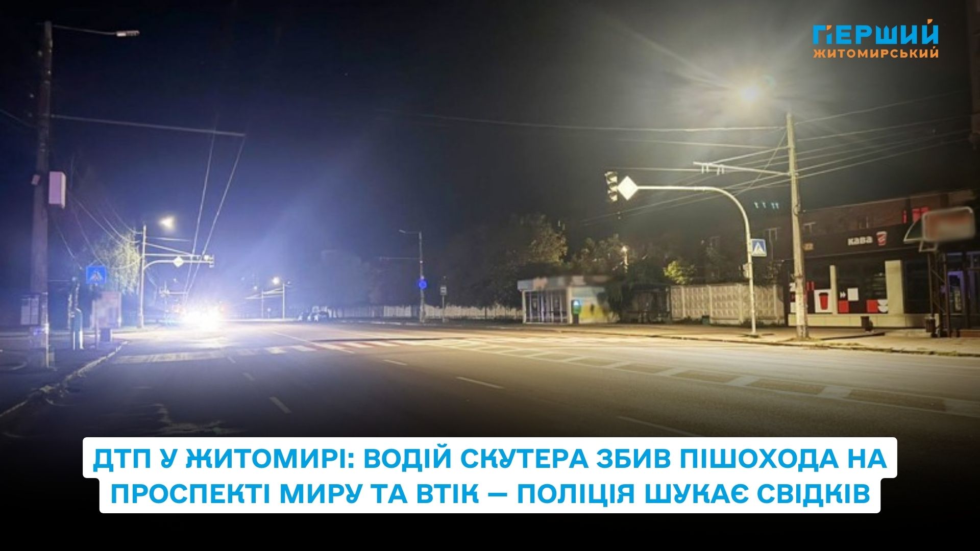 Уночі 21 вересня 2025 року на проспекті Миру в Житомирі сталася ДТП: скутер збив пішохода та зник із місця пригоди. За попередньою інформацією поліції, близько 22:25 двоколісний транспорт, рухаючись у напрямку проспекту Незалежності, здійснив наїзд на чоловіка, який перетинав проїжджу частину, після чого водій поїхав.