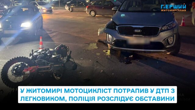 Мотоцикліст у ДТП у Житомирі отримав травми внаслідок зіткнення з автомобілем. Аварія сталася ввечері 24 вересня на проспекті Незалежності. Про це повідомили у Головному управлінні Національної поліції в Житомирській області.