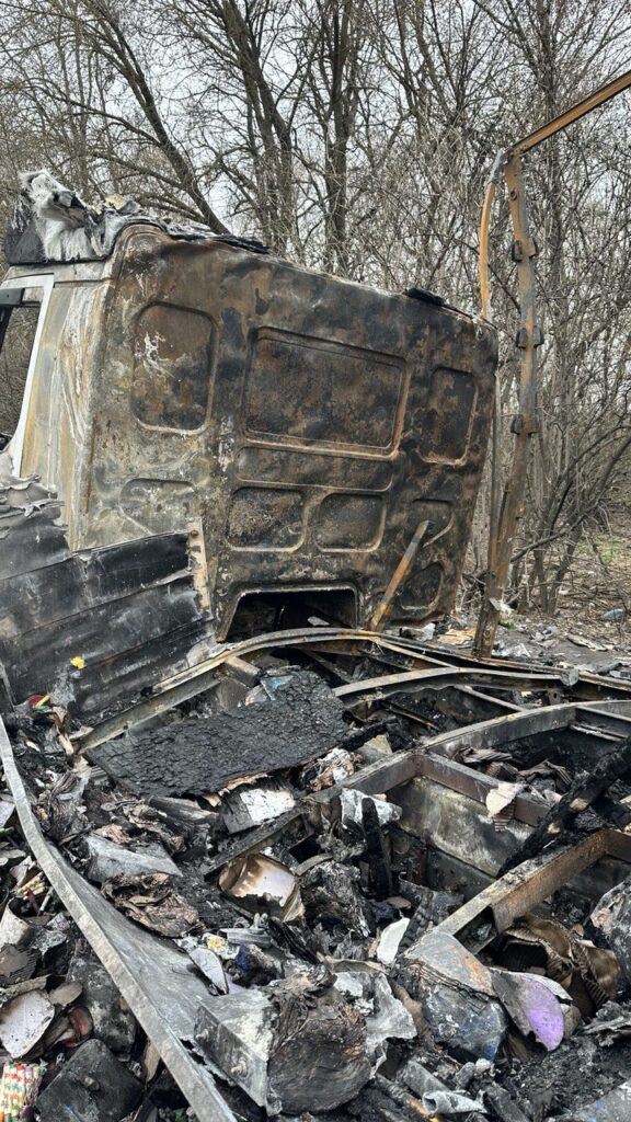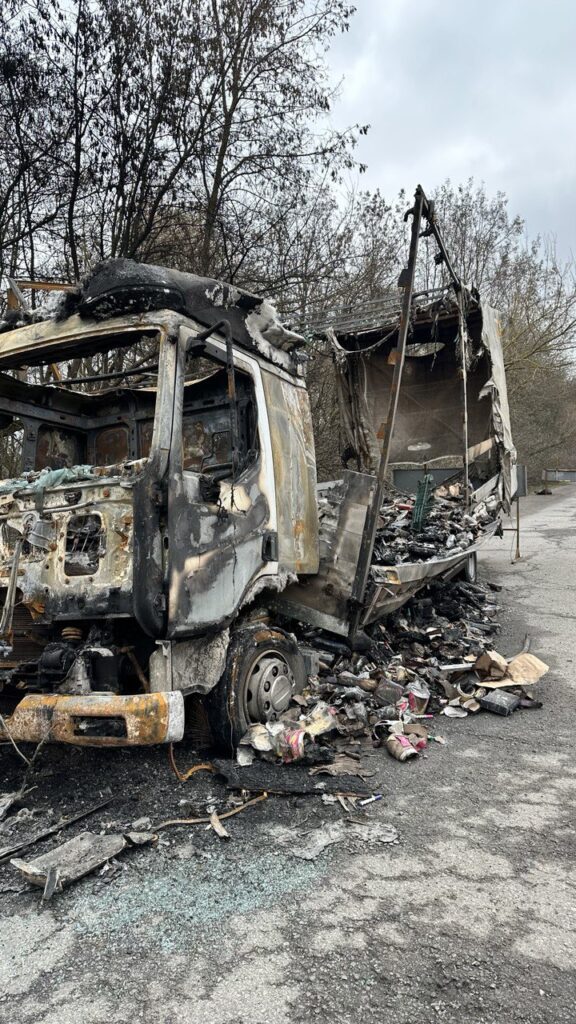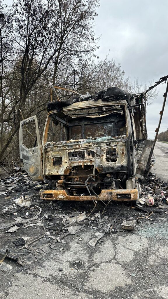 На трасі Житомир – Бердичів у бік Житомира поблизу повороту на с. Кодня вже декілька днів на обочині та частково проїжджій частині стоїть повністю знищена вантажівка. Видно, що автомобіль повністю згорів.