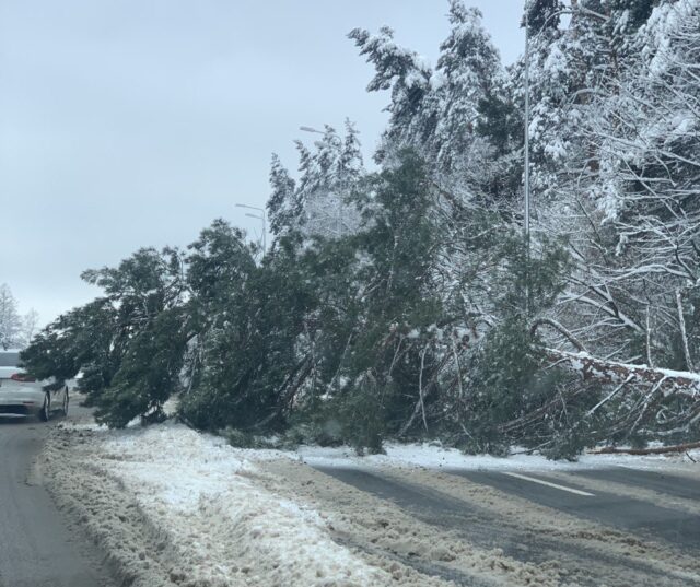На Житомирщині на автодорозі М-21 на відрізку з Житомира до Бердичева через негоду складна ситуація – на проїжджу частину впала ялина. Біля падіння дерева сталася ДТП.