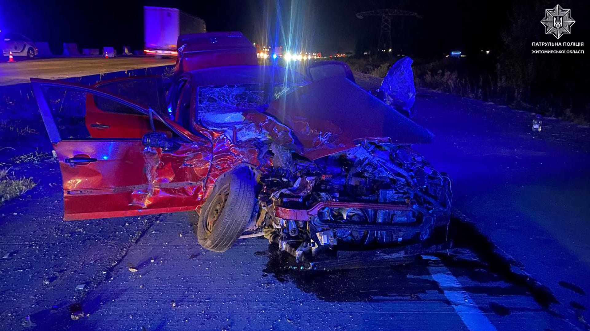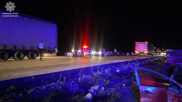 “У зв’язку з дорожньо-транспортною пригодою з потерпілими, що сталась сьогодні ввечері на 142 км автодороги Київ — Чоп (об’їзна міста Житомира, поблизу села Сонячне, Житомирської області), за участю вантажівки DAF та легковика Peugeot, рух транспорту ускладнений в обох напрямках, організовано реверсивний рух”.