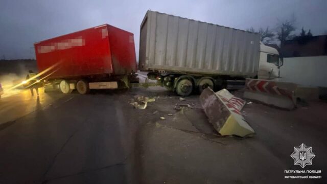 “У зв’язку з дорожньо-транспортною пригодою з потерпілими, що сталася сьогодні вранці на 143 км автодороги Київ — Чоп (об’їзна міста Житомира), смуга руху в напрямку міста Рівне перекрита, рух транспорту ускладнений”.