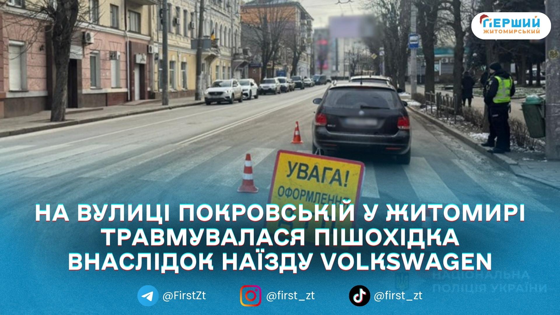 За попередньою інформацією, 25 грудня близько 09:35 автомобіль Volkswagen під керуванням 63-річного житомирянина, рухаючись у напрямку вулиці Київської, здійснив наїзд на жінку, яка перетинала проїзну частину.