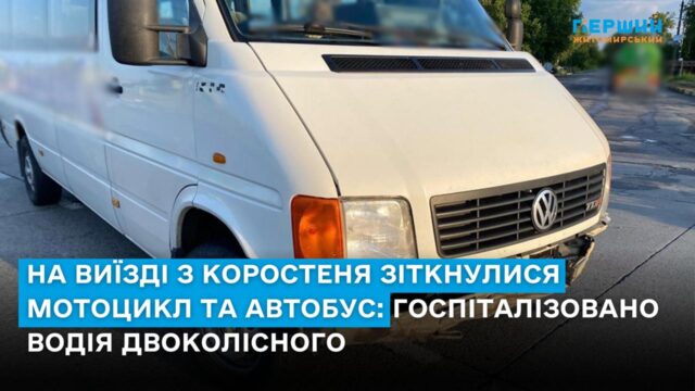Аварія трапилась близько 19:30 на перехресті вулиці Сергія Кемського з автодорогою Київ – Ковель – Ягодин. За попередніми даними, відбулося зіткнення автобуса Volkswagen LT-35, за кермом якого перебував 57-річний житель Житомира, та мотоцикла Suzuki, яким керував молодий коростенець.