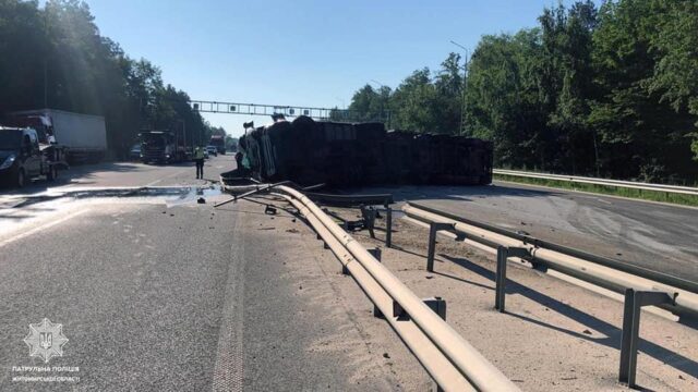 6 червня близько 8 ранку на трасі Київ-Чоп поблизу села Березівка сталась дорожньо-транспортна пригода з потерпілими – перекинулася вантажівка.