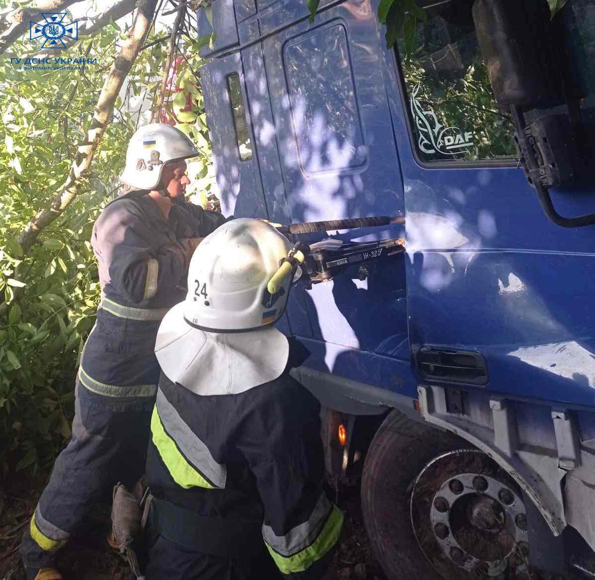 “8 серпня о 06:45 до Служби порятунку “101” надійшла інформація, що необхідна допомога у деблокуванні людини з пошкодженого внаслідок дорожньо-транспортної пригоди вантажівки.