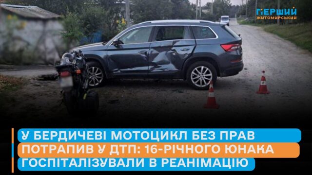 Унаслідок аварії неповнолітній водій мотоцикла отримав тілесні ушкодження. Його доставили до реанімаційного відділення Бердичівської міської лікарні.