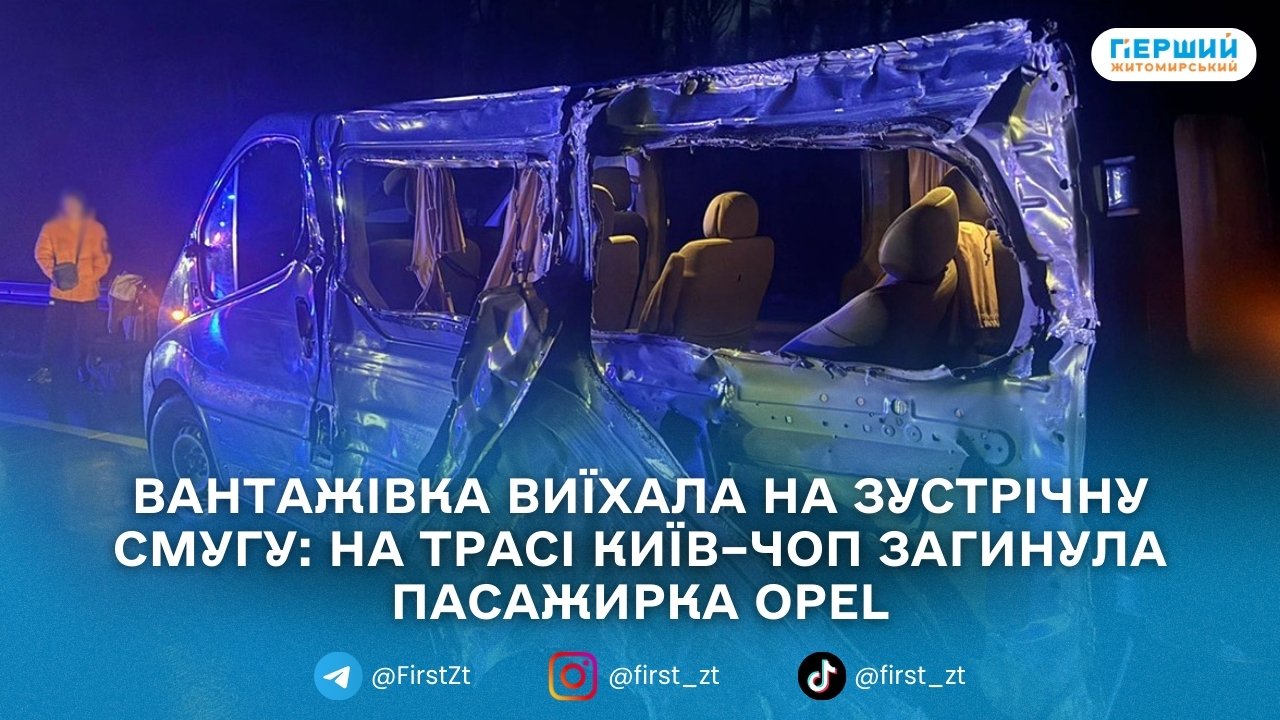 На автодорозі Київ–Чоп неподалік Житомира сталася подвійна дорожньо-транспортна пригода за участю вантажівки, легковика та мікроавтобуса. Унаслідок аварії загинула 19-річна пасажирка мікроавтобуса Opel. Про це повідомили в Головному управлінні Нацполіції в Житомирській області.