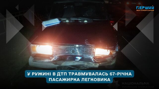 У ДТП у Бердичівському районі, що сталася ввечері 19 листопада в селищі Ружині, травмувалась 67-річна пасажирка легкового автомобіля. Про це повідомили в Головному управлінні Нацполіції в Житомирській області.