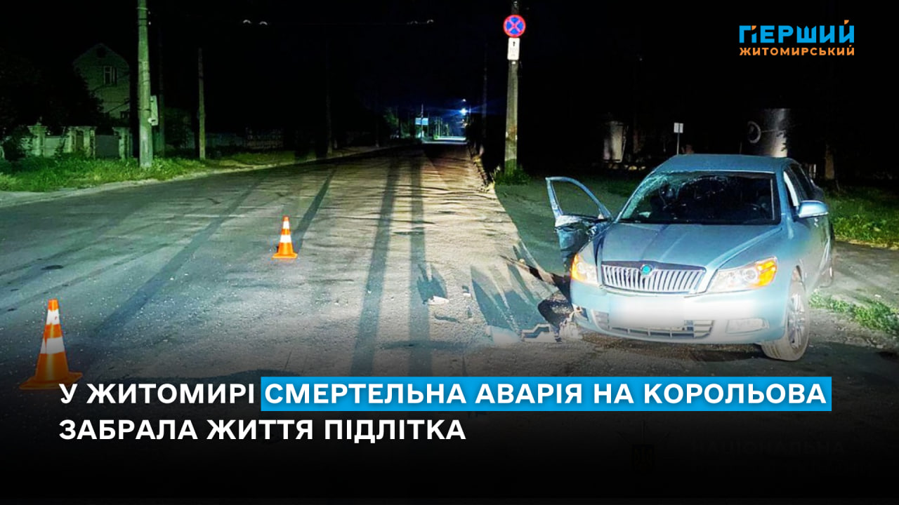 Вночі 7 липня на вулиці Корольова у Житомирі сталася серйозна дорожньо-транспортна пригода, внаслідок якої загинула 16-річна дівчина. Про це повідомило Головне управління Національної поліції у Житомирській області.