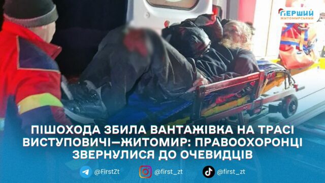 У передмісті Житомира вантажівка збила пішохода, який перебував на проїзній частині. ДТП сталася 28 січня близько 01:10 на 186 км автошляху Виступовичі – Житомир – Могилів-Подільський, неподалік села Зарічани, повідомили в ГУНП у Житомирській області.