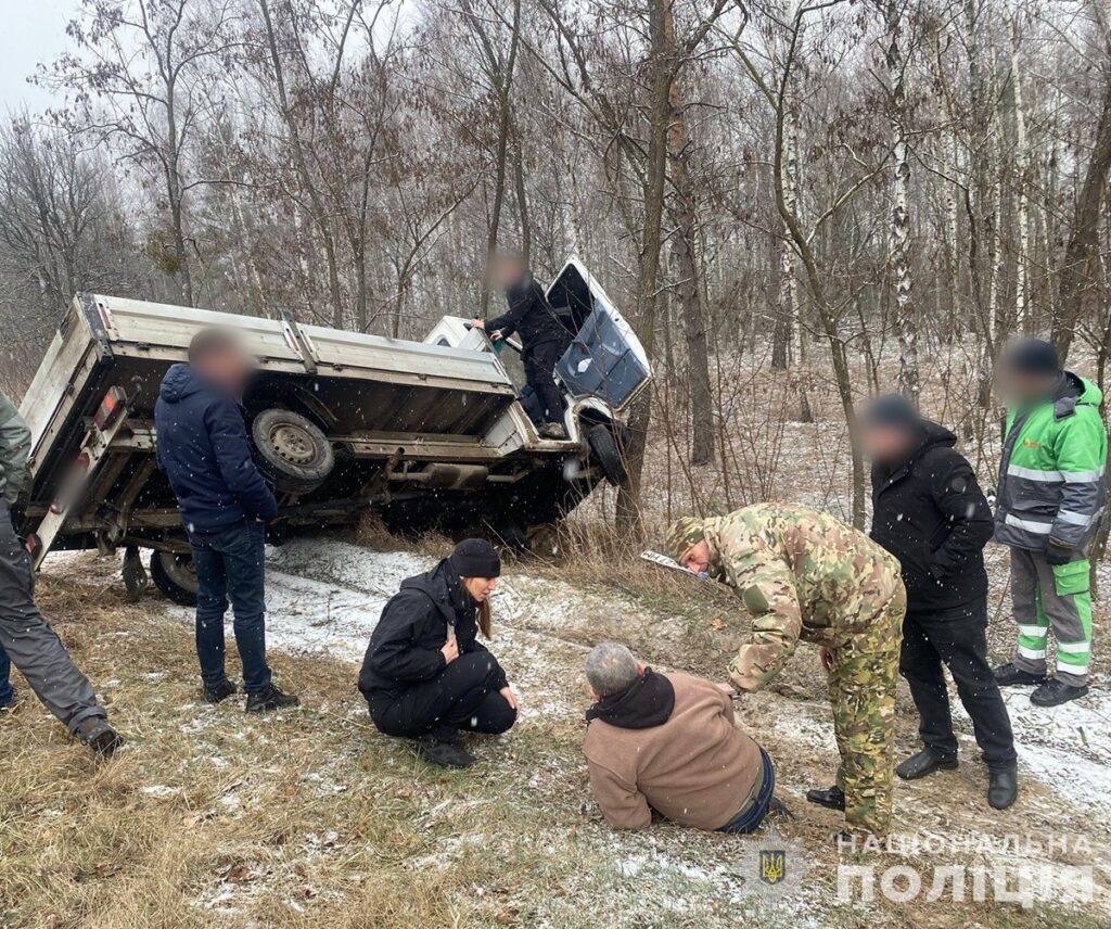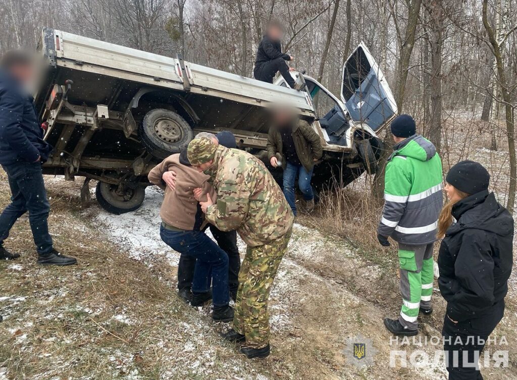 Поліцейські допомогли водію вибратися з пошкодженої кабіни та оглянули його стан. Вони викликали медиків та передали травмованого чоловіка лікарям, які госпіталізували його.