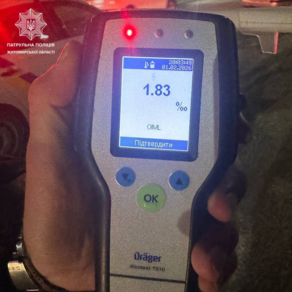 Під час спілкування з водієм патрульні виявили ознаки алкогольного сп’яніння. Чоловік погодився пройти огляд на місці — прилад показав 1,83 проміле.