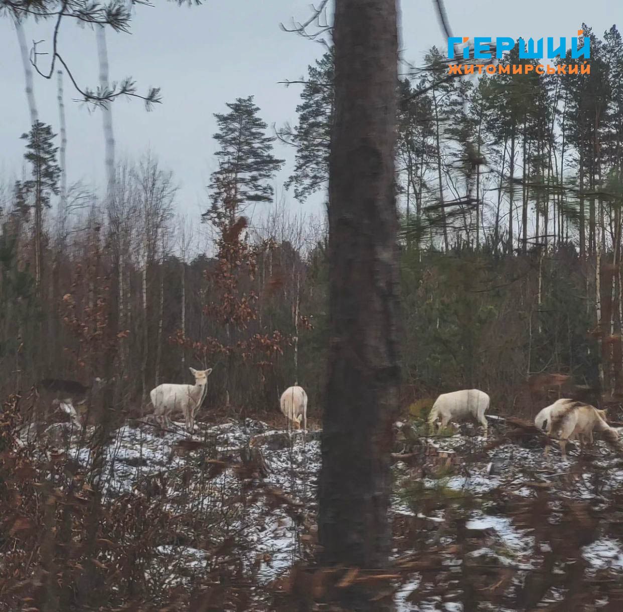 Днями читачі Першого Житомирського повідомили нам про те, що помітили в лісах області незвичних для нашої місцевості тварин – білих ланей. На відео видно як тварини спокійно випасаються поряд з більш звичними нашому оку представниками цього виду. Раніше ми зазначали, що це білі козулі, однак, завдяки повідомленням читачів, перевіривши інформацію, встановили, що насправді ця тварина, що привернула увагу людей є ланню.