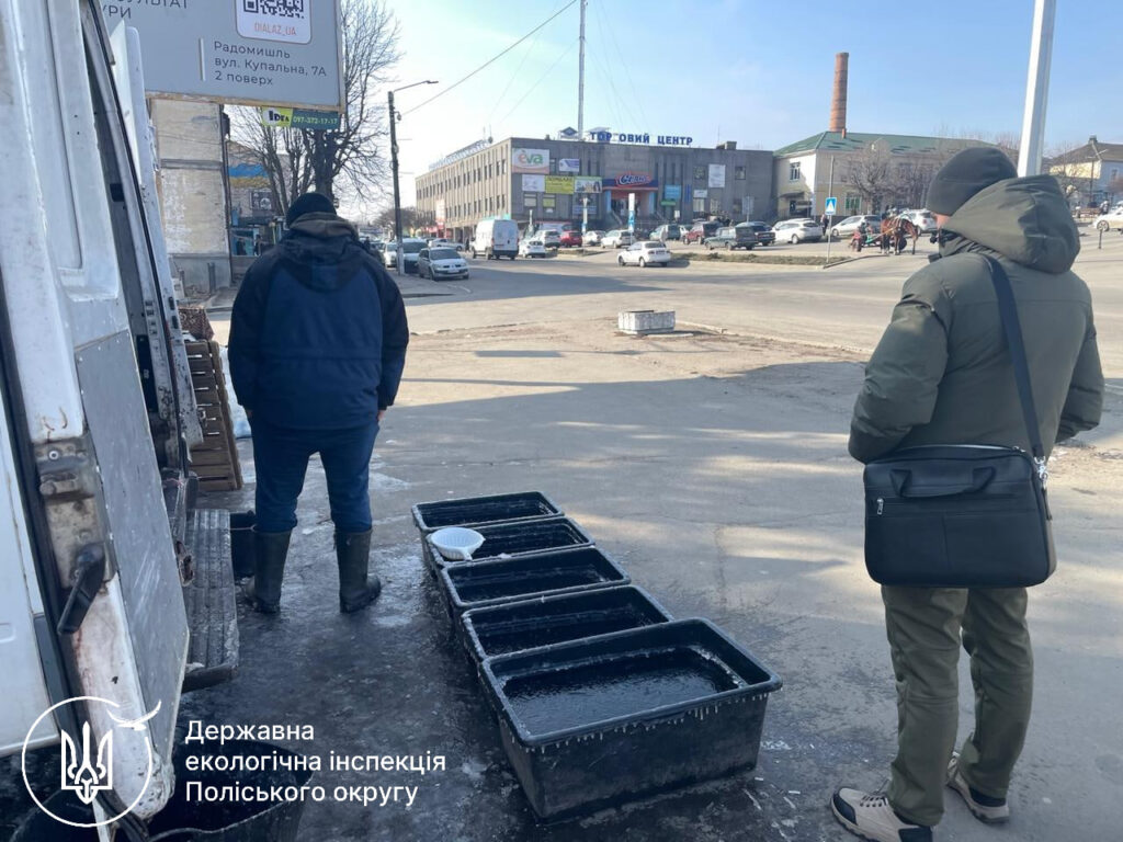 12 лютого 2025 року в місті Радомишль державні інспектори з охорони навколишнього природного середовища Поліського округу виявили факт незаконної реалізації водних біоресурсів. На продаж виставили товстолоба, карася та коропа без відповідних документів, що засвідчують їх походження. Про це повідомляє Держекоінспекція Поліського округу.