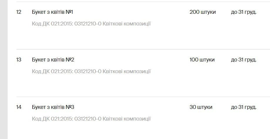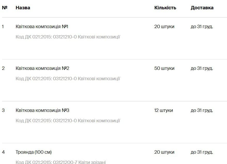 Зокрема, за ці гроші планують придбати 1858 штук зрізаних квітів та квіткових композицій, серед яких – тюльпани, троянди різної довжини, хризантеми, гвоздики, іриси, композиції сезонних квітів та квіти в коробках.