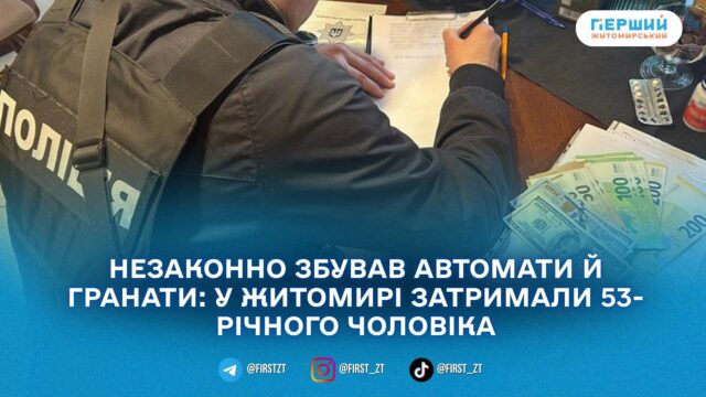 У Житомирі затримали 53-річного чоловіка, якого підозрюють у незаконному збуті зброї та боєприпасів. За даними поліції, він продав два автомати Калашникова, три бойові гранати, а також може бути причетним ще до одного продажу автомата.