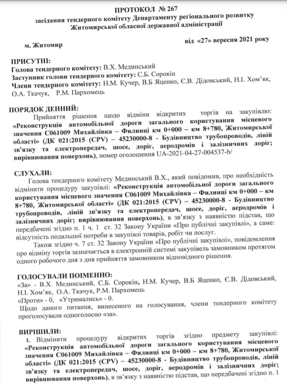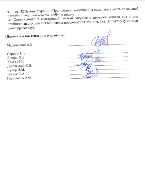 “Голова тендерного комітету Мединський В.Х., який повідомив про необхідність відмінити процедуру закупівлі … в зв’язку з наявністю підстав, а саме: відсутність подальшої потреби в закупівлі товарів, робіт чи послуг”, – йдеться у протоколі.