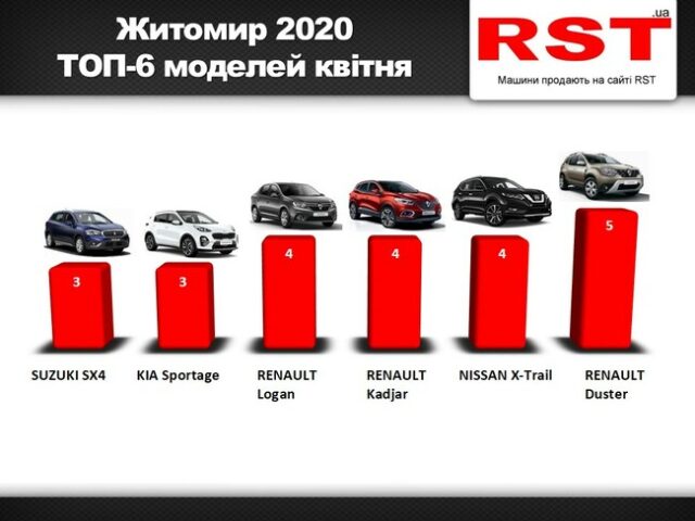 Бестселером у Житомирі став кросовер Renault Duster. Крім нього були популярними Nissan X-Trail і Renault Kadjar.