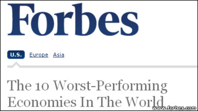 Впливовий журнал "Forbes" опублікував рейтинг 10 найгірших економік світу, де Україна посіла четверте місце, пропустивши вперед Мадагаскар, Вірменію та Гвінею. Повідомляє ВВС.