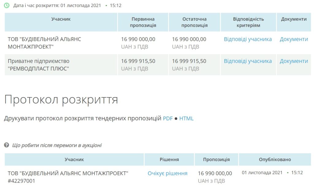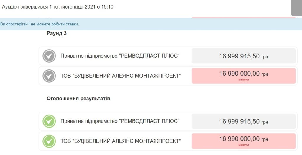 1 листопада пройшов аукціон на визначення підрядника, мінімальну суму в якому – 16 млн 990 тис. грн – запропонувало ТОВ “Будівельний Альянс Монтажпроект”. Тобто ціна під час аукціону знизилася лише на 10 тис. грн. Цікаво, що участь в аукціоні брали лише дві фірми, одна з яких – ПП “Ремводпласт Плюс”. Вони ж змагалися і за 6-мільйонний тендер на виготовлення проєкту реконструкції обласної дитячої лікарні.