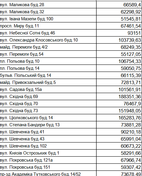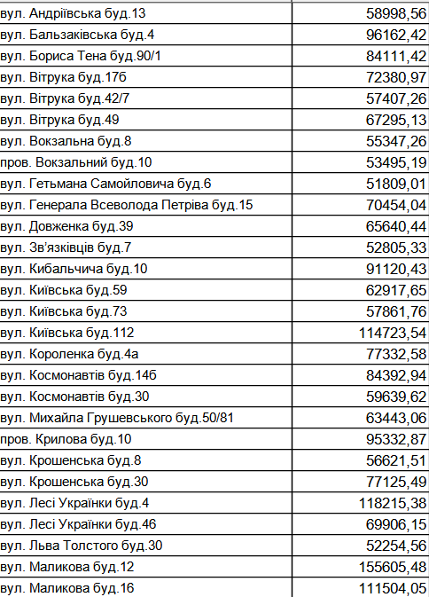 Перелік адрес, які боргують за воду від 50 тис. грн.