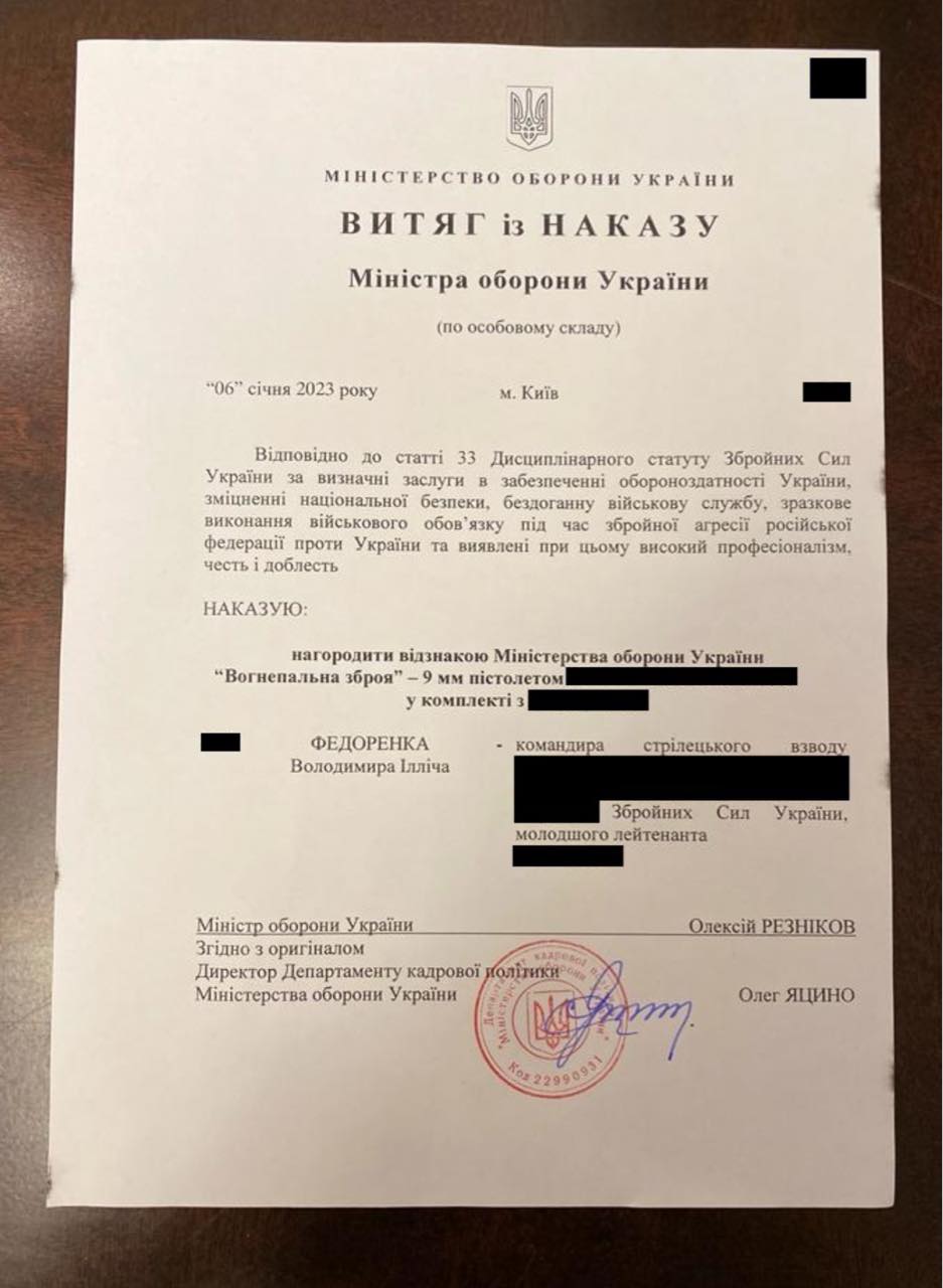 “Щиро дякую пану Міністру оборони України, командуванню та побратимам! За Україну, за її волю,За честь і славу, за народ! Слава ЗСУ!“, – написав Федоренко.