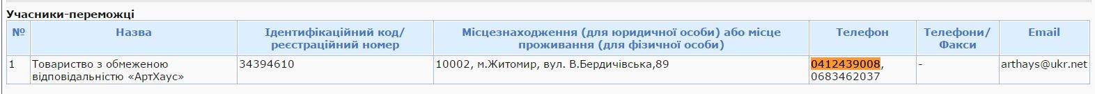 Фірма прописана по вул. Велика Бердичівська, 89 разом із ТОВ «Артхаус» Михайла Лисака, яким керує Василь Герасимчук. У них також співпадає номер телефону +380412439008. Усього з 2008 р. «Артхаус» виграв торгів на 120,52 млн грн.