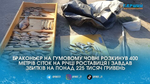 Інцидент стався на річці Роставиця у селі Дерганівка. Як повідомляють у Житомирському рибоохоронному патрулі, браконьєра викрили під час спільного рейду з місцевою поліцією. Виявилося, що чоловік на гумовому човні перегородив річку вісьмома сітками загальною довжиною аж 400 метрів.