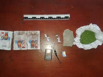У згортку знаходились один пакунок із зеленою подрібненою масою рослинного походження, два пакунки з темно-коричневою речовиною невідомого походження, а також три колоди гральних карт, одна батарея живлення для мобільного телефону, одна сім-картка та зарядний пристрій до мобільного телефону.