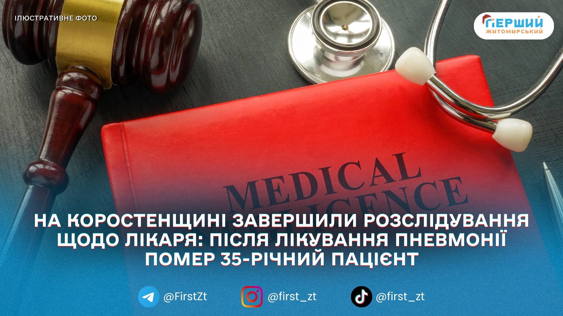Коростенські поліцейські завершили досудове розслідування щодо 59-річного лікаря, якому інкримінують неналежне виконання професійних обов’язків, що спричинило смерть пацієнта. Про це повідомили в ГУНП у Житомирській області.