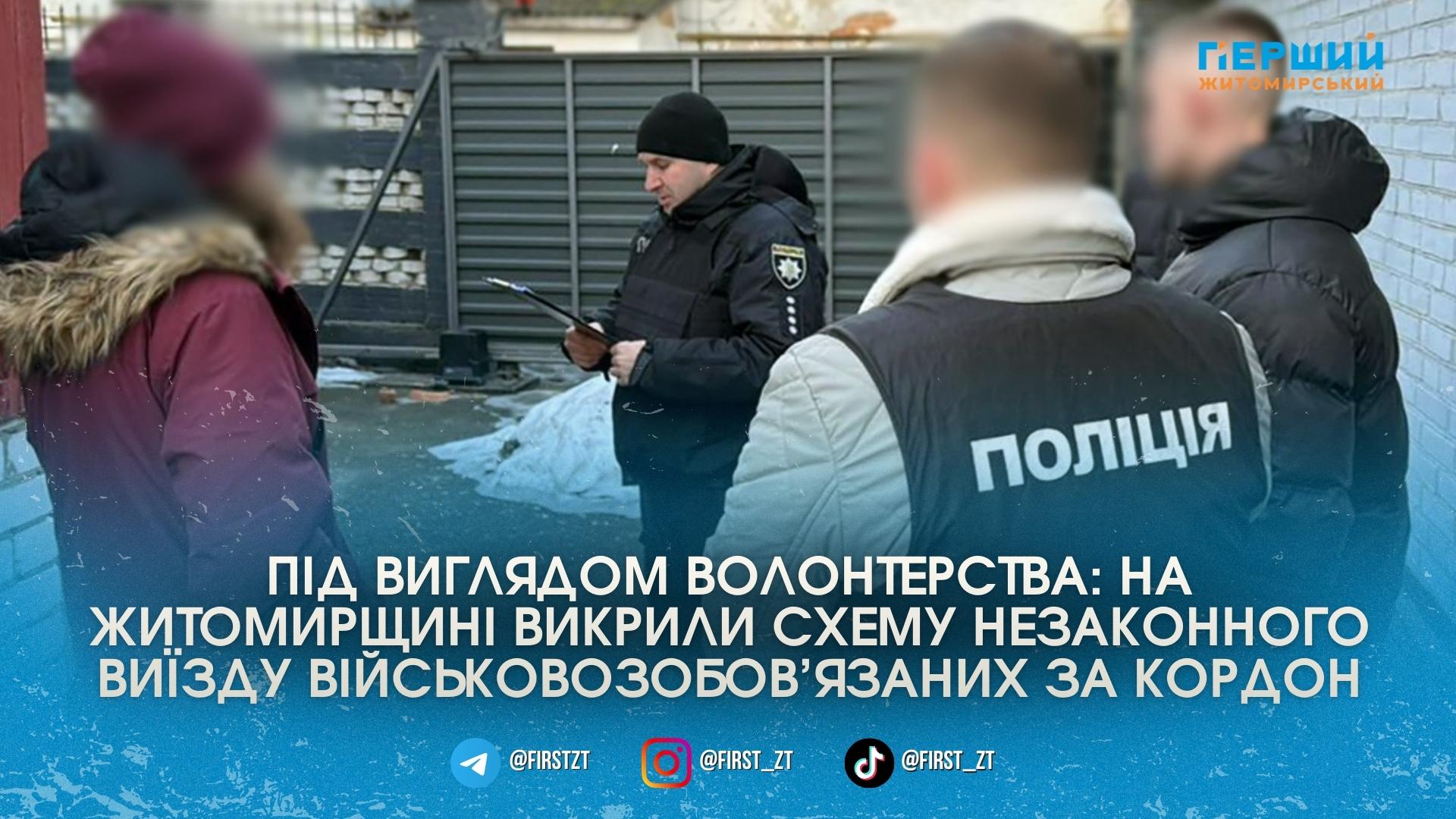 На Житомирщині поліцейські викрили схему незаконного виїзду військовозобов’язаних чоловіків за кордон під виглядом волонтерської діяльності. Про це повідомив Відділ комунікації поліції Житомирської області.