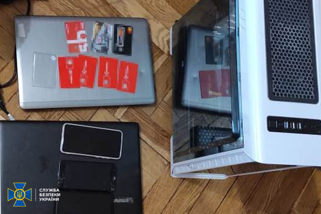 Під час обшуків вилучили комп’ютерну техніку та мобільні телефони, сотні карток українських операторів мобільного зв’язку, банківські картки, які використовувалися для виведення і зняття готівки.