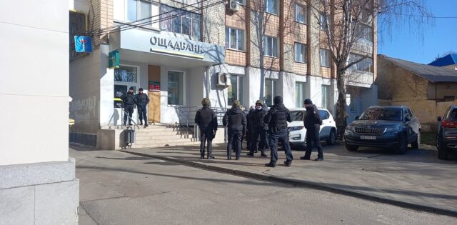 У Житомирі знову «замінування». На цей раз «замінували» відділення «Ощадбанку» біля міської ради, за адресою майдан С. П. Корольова, 8.