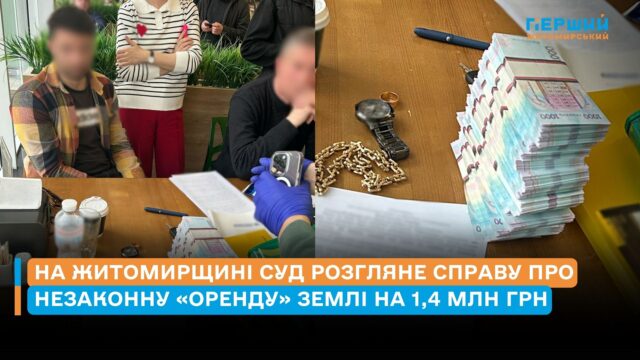 Фермер звернувся до правоохоронців, після чого слідчі та співробітники СБУ задокументували обставини. Під час передачі 1,4 млн грн на одній із АЗС Житомира підозрюваних затримали.