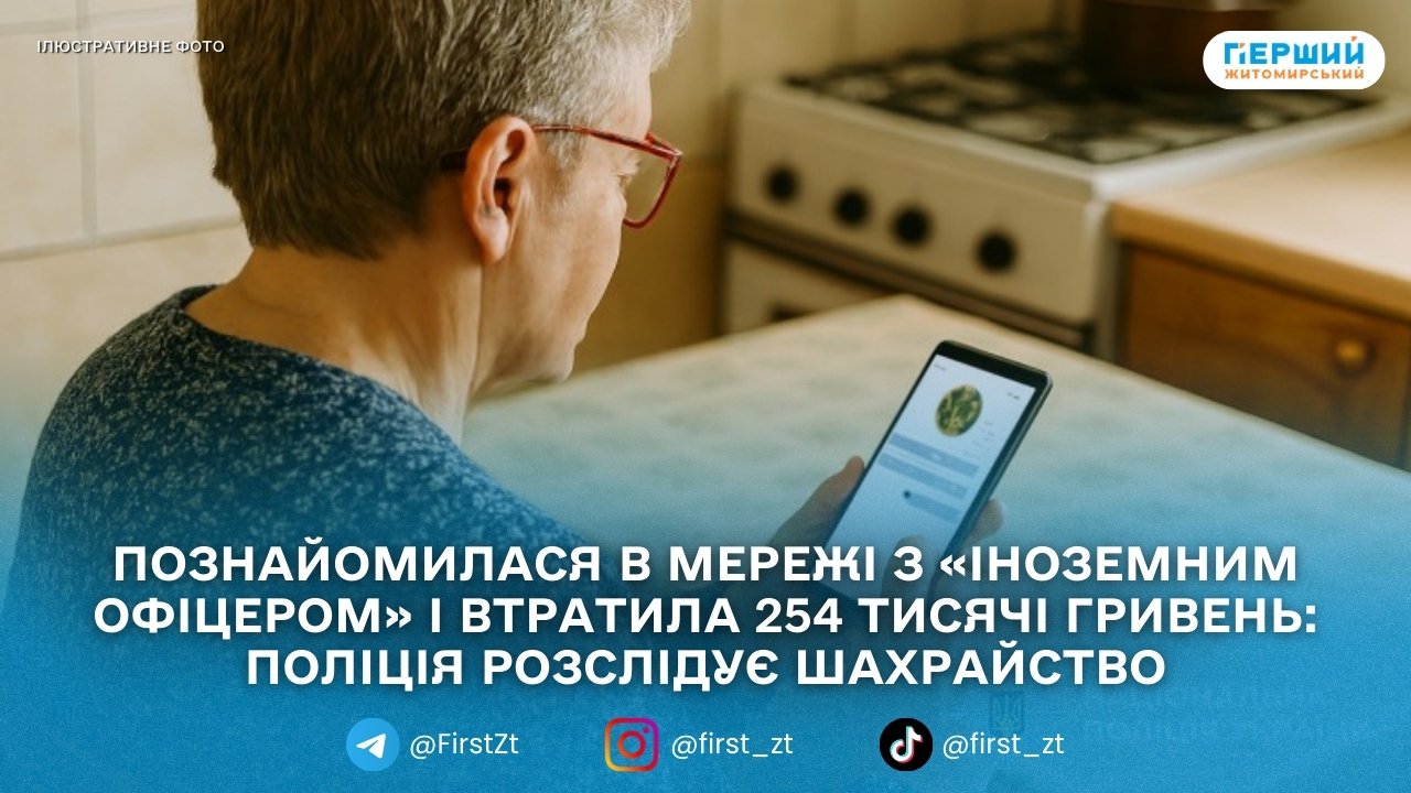 У Бердичеві 66-річна місцева жителька втратила 254 тисячі гривень після знайомства в соцмережі з чоловіком, який представився іноземним офіцером. Поліція розпочала розслідування за фактом шахрайства. Про це повідомили в Головному управлінні Нацполіції в Житомирській області.