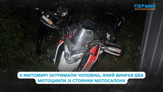 Патрульні поліцейські Житомира затримали 30-річного чоловіка, який, за попередніми даними, незаконно заволодів двома мотоциклами зі стоянки мотосалону на вулиці Вітрука.