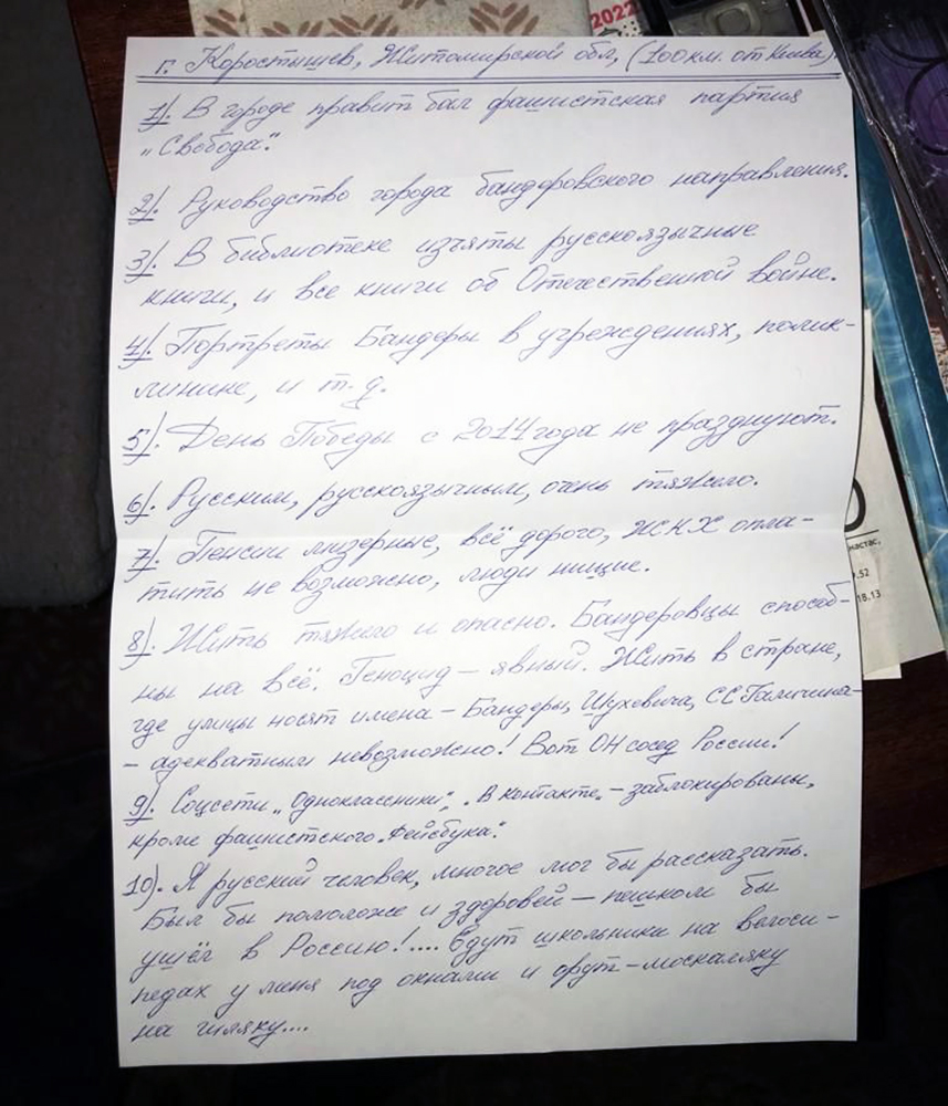 17 квітня обшуки провели в жителя Коростишева. Пенсіонер у соцмережах мережах робив публікації на користь російської агресії в Україні. З оселі чоловіка поліцейські Коростишівського відділу ГУНП Житомирщини вилучили комп’ютерну техніку, ворожу символіку, письмові «заготовки» постів для коментарів тощо. Йому оголосили підозру у колабораційній діяльності.