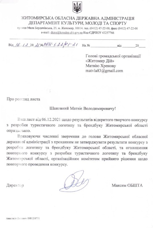 «Ми отримали відповідь на наше звернення, в якому зазначається: “Враховуючи численні звернення до голови Житомирської обласної державної адміністрації з проханням не затверджувати результати конкурсу з розробки логотипу та брендбуку Житомирської області, організаційним комітетом прийнято рішення щодо повторного проведення конкурсу”», – пояснює голова ГО.