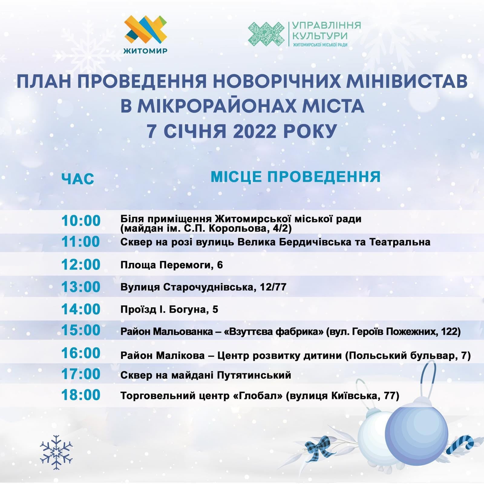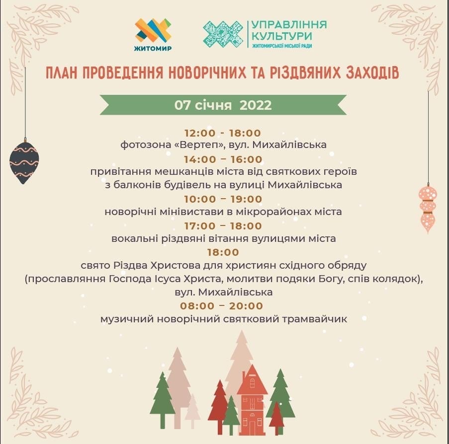 Крім того, вдень на пішохідній вулиці з балконів будівель житомирян вітатимуть казкові герої. Головне дійство відбудеться о 18:00. Також на Михайлівські будуть молитися та співати колядки.