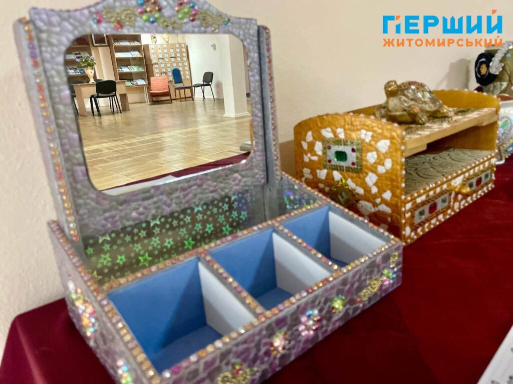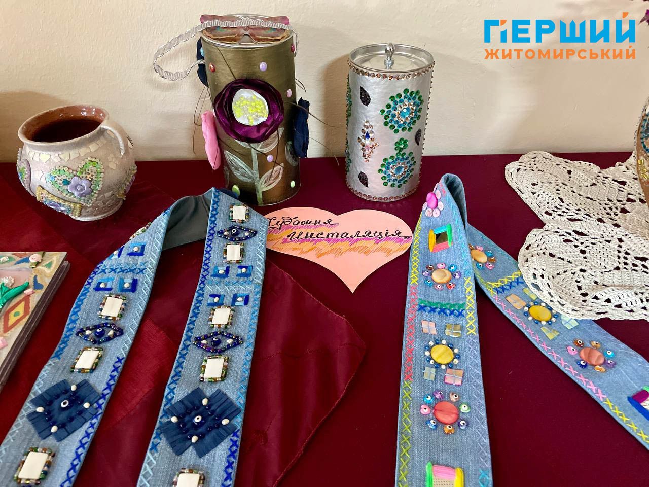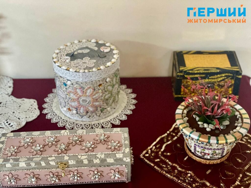 Зокрема, серед представленого – прикраси, предмети декору та інтерʼєру, панно, вбрання, картини, вази, скриньки, текстильний колаж, художня інсталяція та багато іншого, прикрашені природними (дерево, каміння, плоди рослин, квіти, колосся) та штучними матеріалами, блискітками.