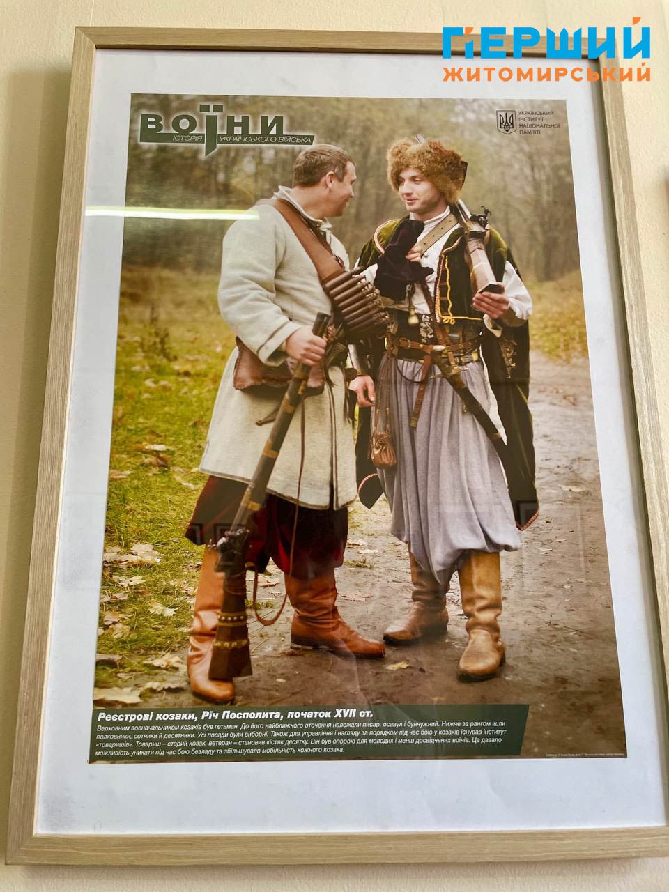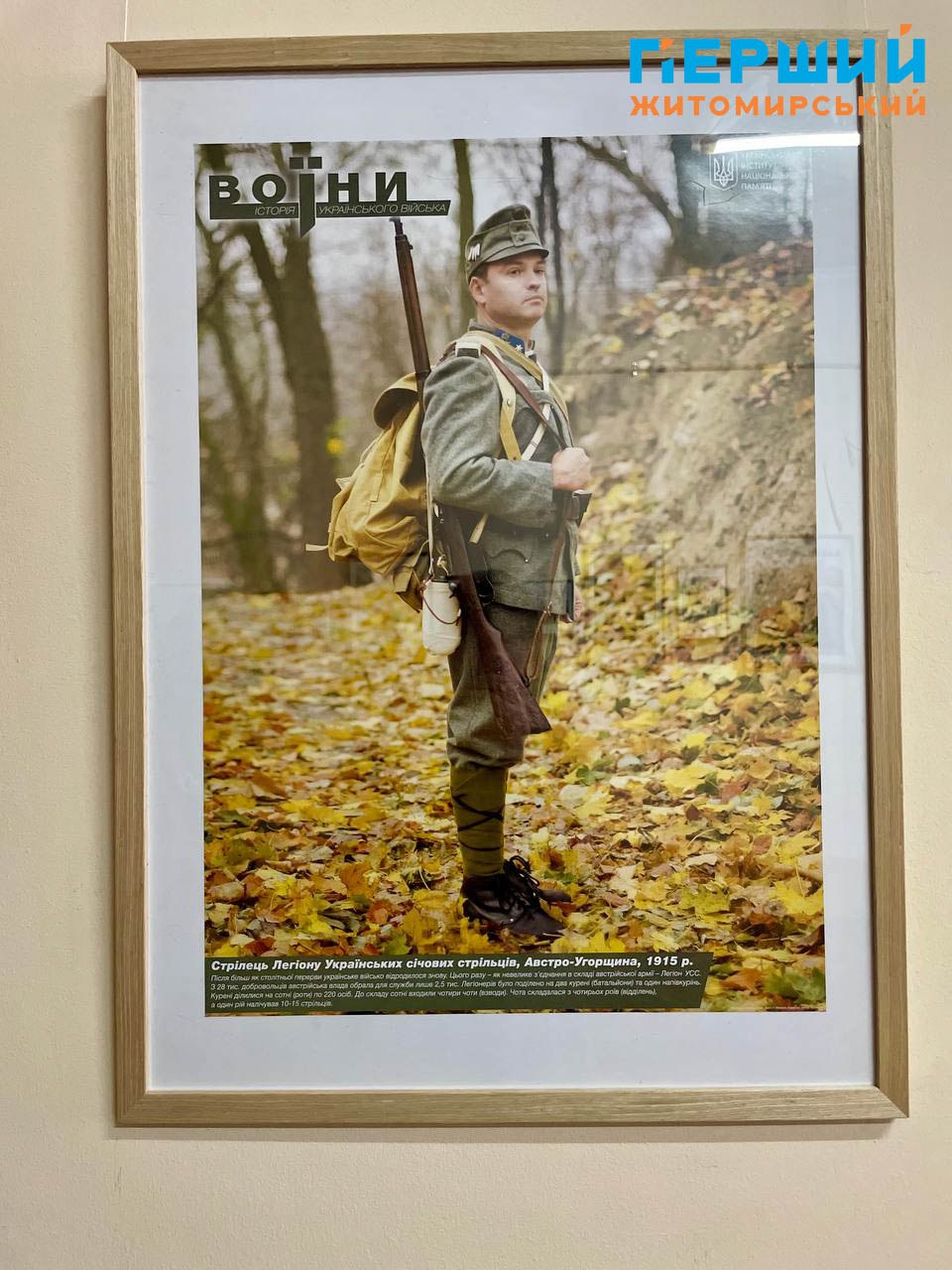Про це розповіла куратор виставки Світлана Віділіна. За її словами, ініціативу вдалося реалізувати спільно із Житомирським військовим інститутом ім. С. П. Корольова. Саме представники цього навчального закладу раніше передали підбірку постерів, що були підготовлені в рамках проєкту «Воїни. Історія українського війська», над яким працювали Зоя Бойченко та Олена Халімон з Українського інституту національної пам’яті. Зокрема, разом з командою фотографів (Анна Сенік, Роман Ніколаєв, Ігор Свенцицький) та історичними реконструкторами (Микола Балабан. Тексти: Василь Павлов, Максим Майоров, Сергій Громенко, Богдан Завітій, Володимир В’ятрович, Наталія Слобожаніна, Сергій Рябенко) вдалося втілити та зафіксувати 20 образів, з яких можна детальніше дізнатися про історію військових формувань на теренах України від часів Київської Русі і до сьогодення, побачити якими були однострої та зброя українських воїнів у різні історичні епохи. Фотографії супроводжує інформація про тип військових організацій, чисельність і озброєння військ, методи воєнного мистецтва, найвизначніші битви певного періоду.