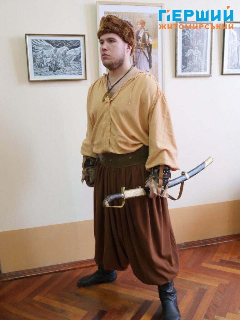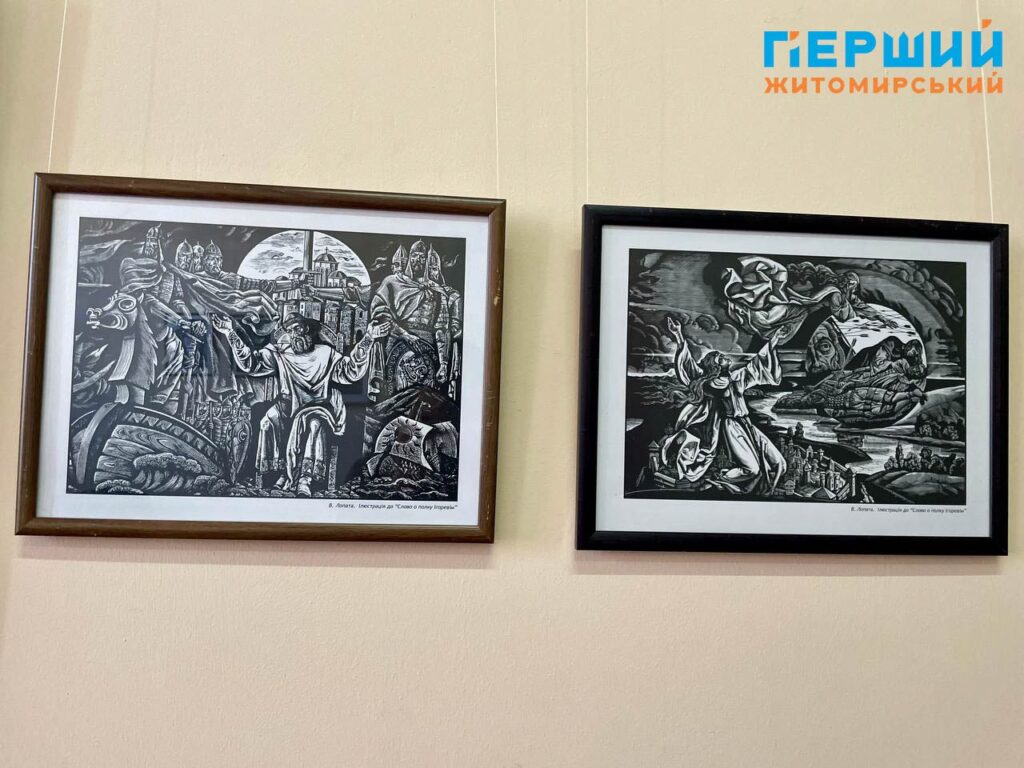 «Ми вирішили поєднати фотографії з реконструкцією військового одягу із темою мистецтва, тож зупинилися саме на графічному мистецтві. Зосередилися на постатях і творчості кількох українських художників, які вже прославилися, залишили свій слід і про них знає увесь світ. Якутовичі – батько та син, уже померли. Лопата – живий, але проживає за кордоном. Хасевич мав художню освіту, пішов у політику, потім вступив у УПА. На виставці є кілька портретів його авторства – малював тих людей, які воювали поряд із ним, очолювали рух. Він створював різні листівки, летючки – все друкована продукція, але не рекламного характеру, а художній твір, по-суті, з політичним підтекстом, – говорить Світлана Віділіна. – Обирали гравюри, на яких є наше воїнство у військових обладунках. Є ілюстрації до «Повісті врем’яних літ», багато козацької тематики (протягом трьох століть). Базилевич, спираючись на дослідження історика Яворницького, створив впізнаваний образ (стереотип) козака-українця з оселедцем, в шаровах. В Якутовичів теж переважає тема Київської Русі, козацтва. Власне, названі художники озвучували літературу, а з сучасного більше у роботах Хасевича».