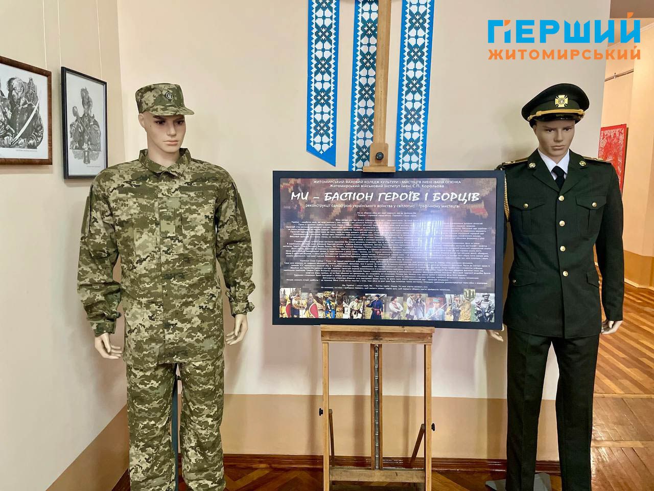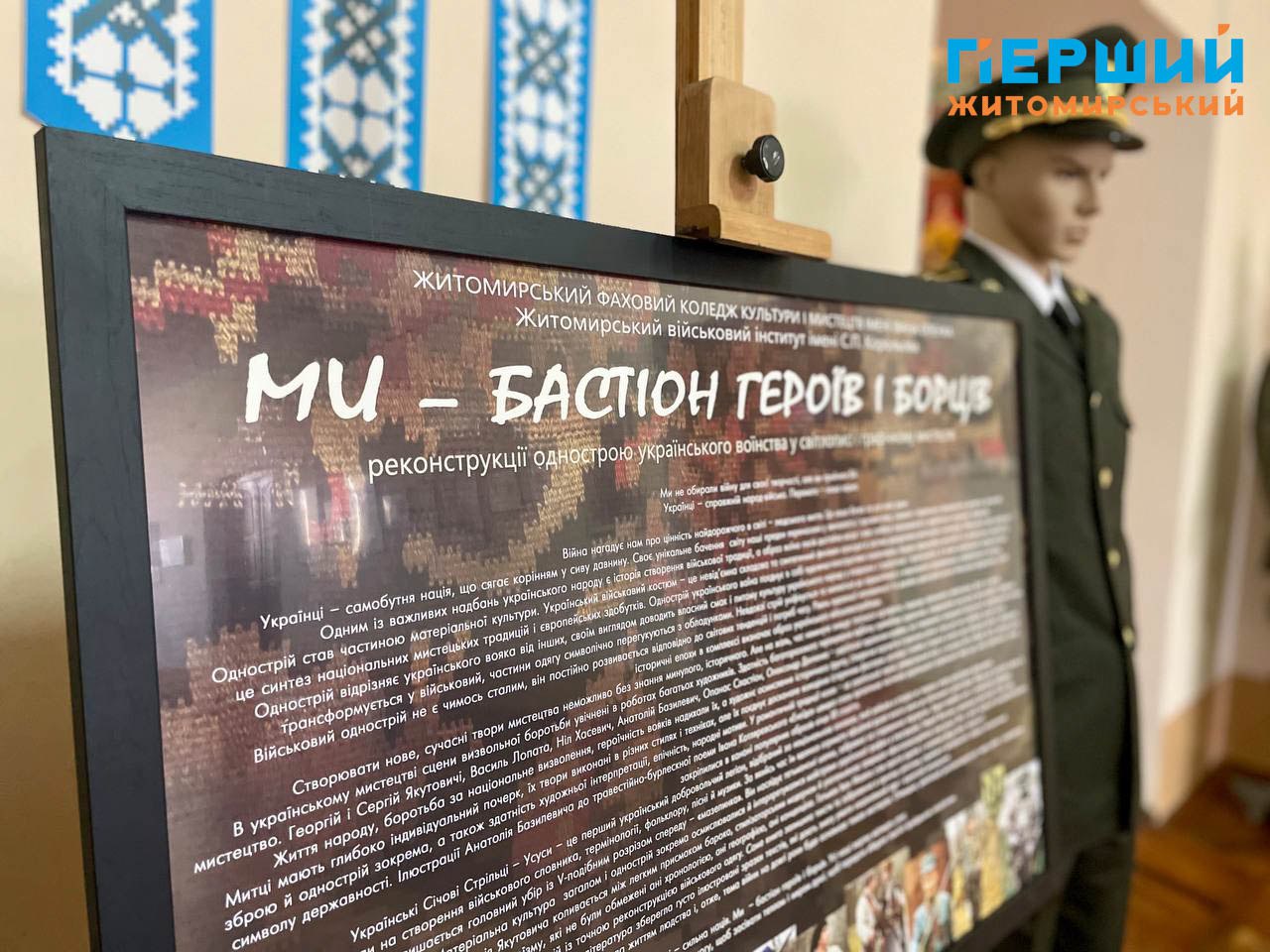 Виставка-реконструкція однострою українського воїнства у світлописі і графічному мистецтві «МИ – БАСТІОН ГЕРОЇВ І БОРЦІВ», яку напередодні другої річниці від початку повномасштабної війни відкрили в Житомирському фаховому коледжі культури і мистецтв ім. Івана Огієнка, триватиме до початку квітня цього року. Відвідати її можна у будні з 9:00 до 18:00 за адресою вул. Івана Франка, 16, ІІ поверх.
