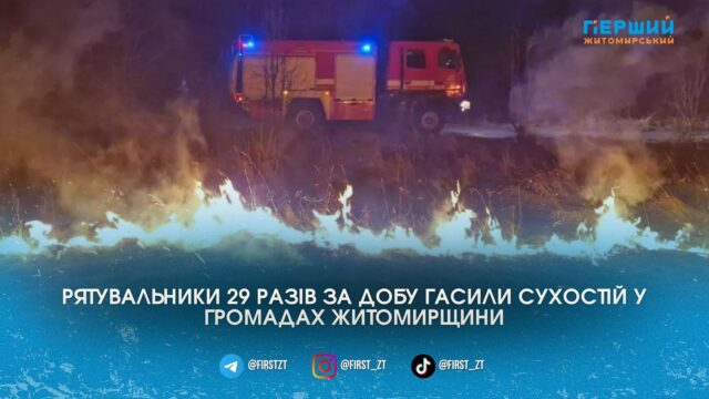 Упродовж минулої доби рятувальники Житомирщини 29 разів виїжджали на гасіння пожеж сухої рослинності. Загалом вогнем пройдено понад 24 гектари території. Про це 29 березня повідомили в ГУ ДСНС у Житомирській області.